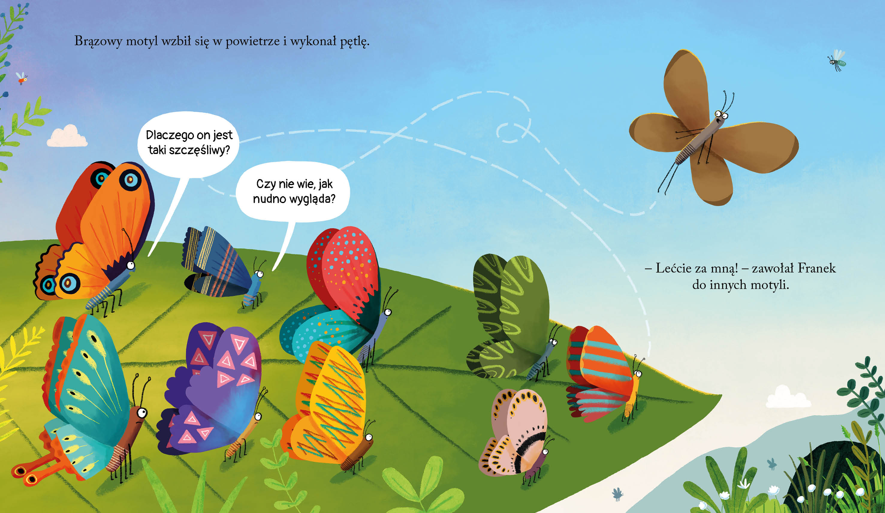Franek był kiedyś jednym z wielu maleńkich jajeczek, potem jedną z żarłocznych gąsienic, aż wreszcie zamienił się w jedną z poczwarek. Ale od początku nieco różnił się od innych – nie miał barwnych pasków ani kropek, nie miał jaskrawych zygzaków ani nastroszonych włosków. Był po prostu nudno brązowy. Wcale jednak nie przejmował się tym, że inni wyróżniają się wzorami i kolorami i nie marzył tak jak wszyscy, żeby wzbudzać zachwyt swoim wyglądem. On pragnął tylko jednego i bardzo czekał na ostatnią przemianę. Gdy ta w końcu nastąpiła, Franek był przeszczęśliwy – mógł wreszcie polecieć na łąkę i nad rzekę! Czy inne motyle też cieszyły się ze swojej metamorfozy?