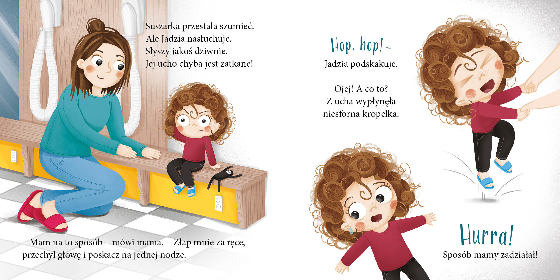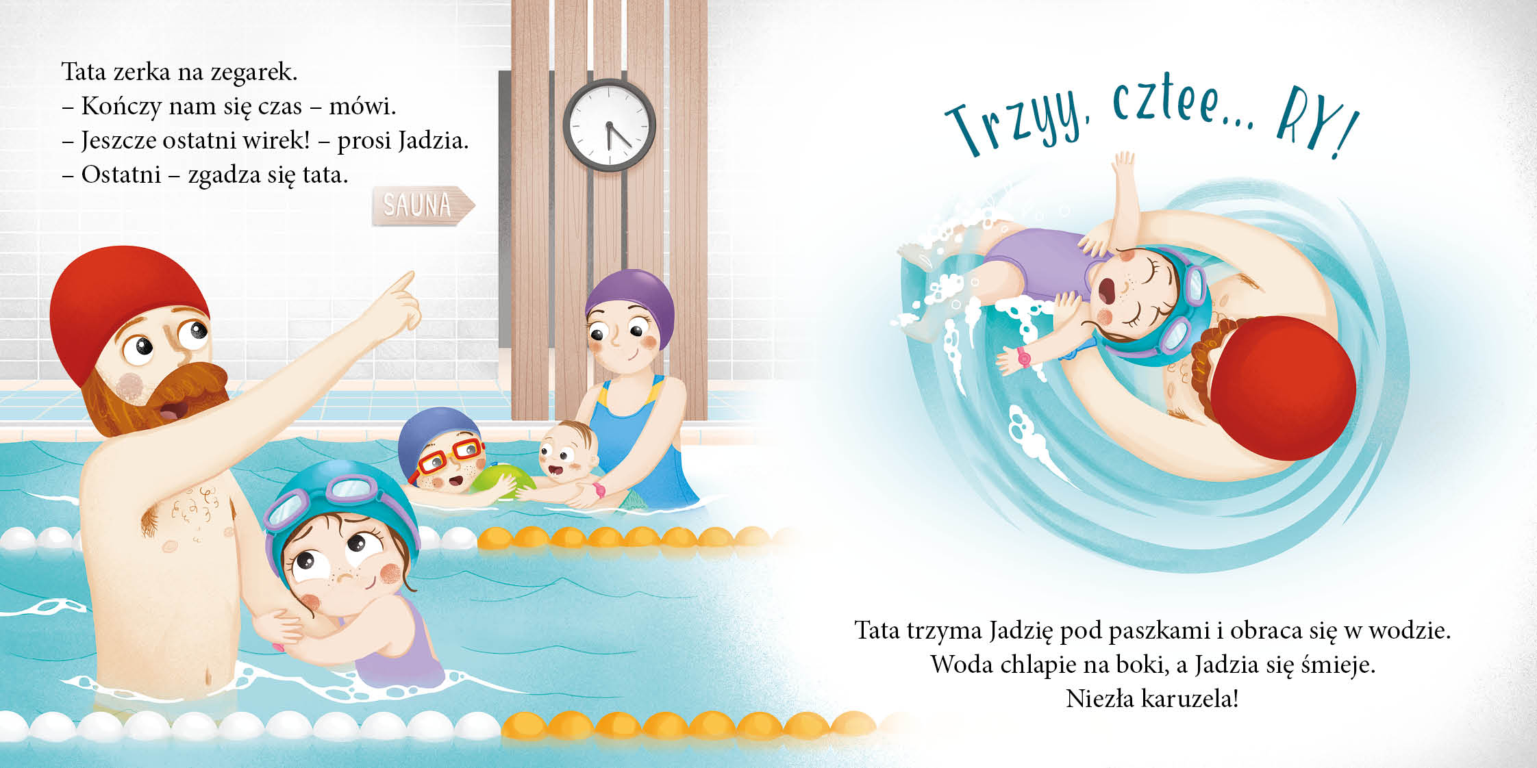 Rodzina Pętelków wybiera się na basen. Jadzia bardzo lubi wodę, ale woli, gdy nos i uszy pozostają suche! Na oczy naciąga okularki, a na uszy czepek. Ubrana w rękawki, wyposażona w deskę, makaron i gumową rybkę, wchodzi z mamą do wody. Czy Jadzia odważy się, tak jak Staś, zanurzyć głowę?