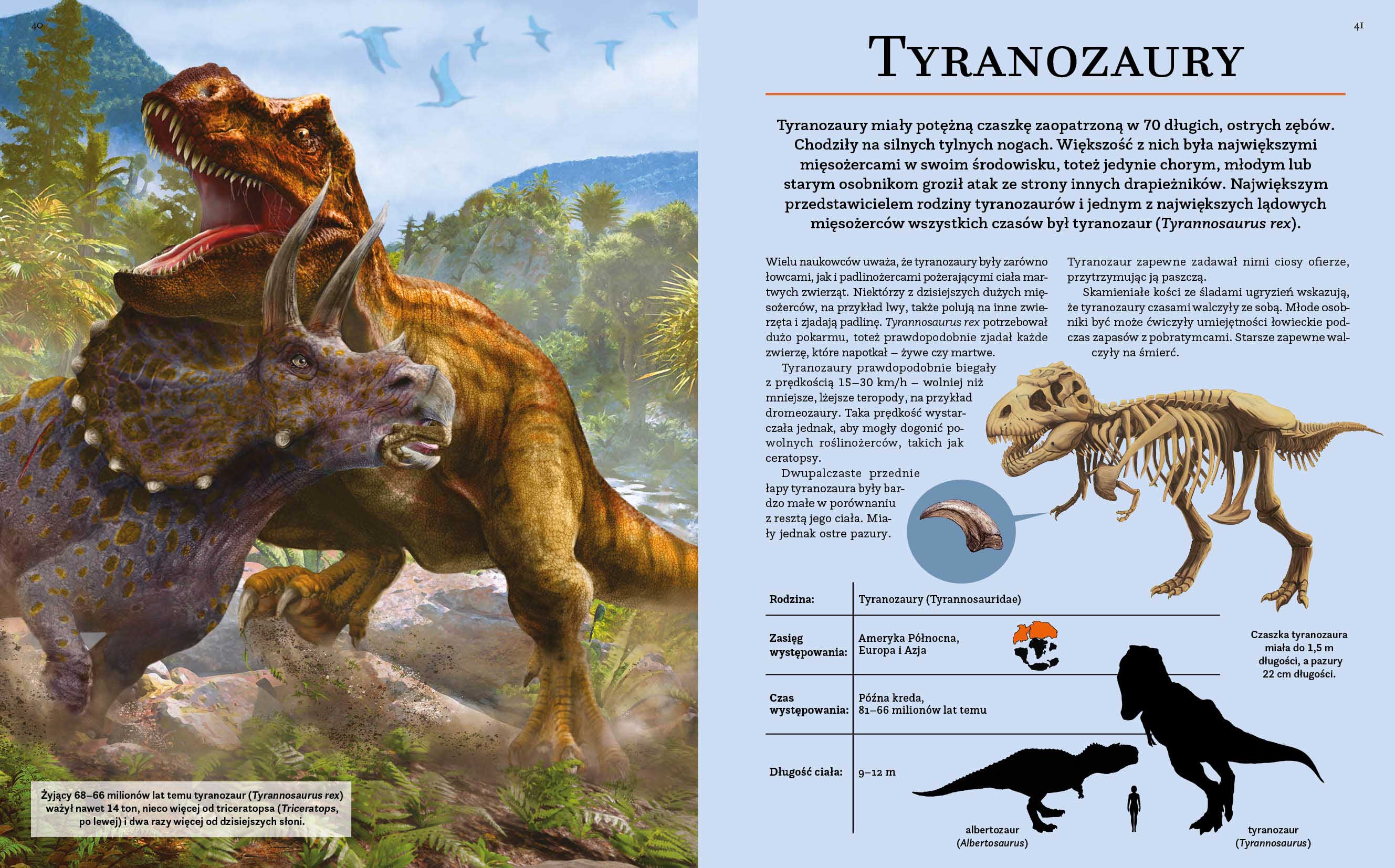 Dzięki temu niezwykłemu, skrupulatnie opracowanemu przewodnikowi staniesz oko w oko z najpotężniejszymi stworzeniami, jakie kiedykolwiek chodziły po Ziemi. Najnowsze dane paleontologiczne przedstawiono tu w jasny, pasjonujący sposób. Odkryj, jakie naprawdę były potężne prehistoryczne gady. Poznaj ich zachowanie oraz instynkty, strategie przetrwania i taktyki łowieckie, drapieżną i zaskakująco czułą naturę. Mistrzowskiej klasy grafiki ukazują majestat migrujących zauropodów, dzikich teropodów, szybujących pterozaurów i nurkujących w głębinach ichtiozaurów.